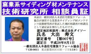 株式会社ダイソー(長野県松本市)会社名:株式会社ダイソー 責任者=相談員氏名:大出 寿文 相談員=役職代表取締役社長相談員の資格建築士窯業サイディングメンテナンス診断士戸建住宅劣化診断士シロアリ防除・木材防腐技術者団体検査員住所〒390-0852 長野県松本市島立810-1TEL0263-47-1337FAX0263-47-3137相談員メールアドレス dai-kaisyu@kra.biglobe.ne.jpホームページhttp://www.tosou-matsumoto.jp/