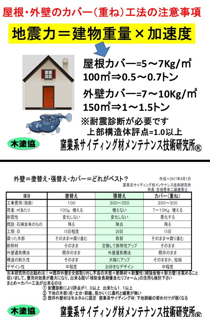 カバー工法では、カバーする建材と、下地材料の荷重が、1トン〜2トンも増えて、