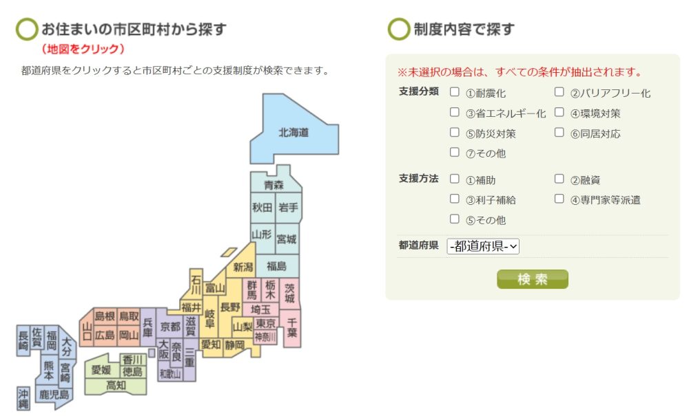 地方公共団体が実施する住宅リフォーム支援制度を検索できます。