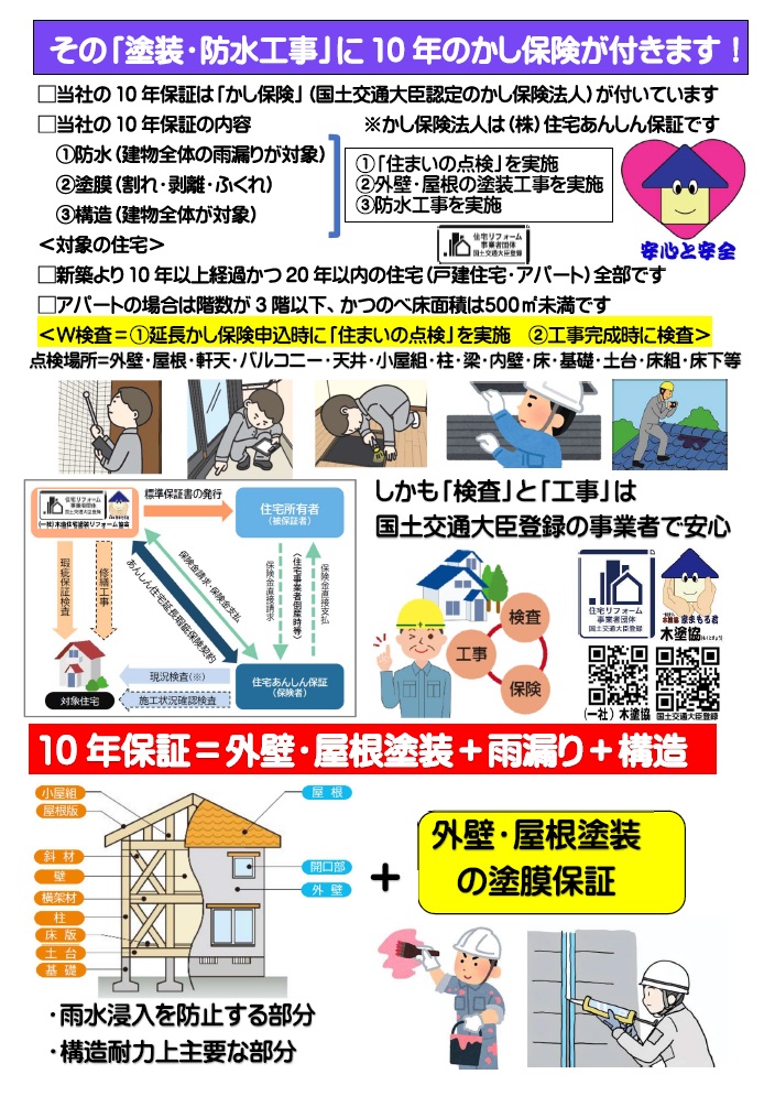 さらには、外壁・屋根の塗膜に関しても10年間の保証が付きますので、