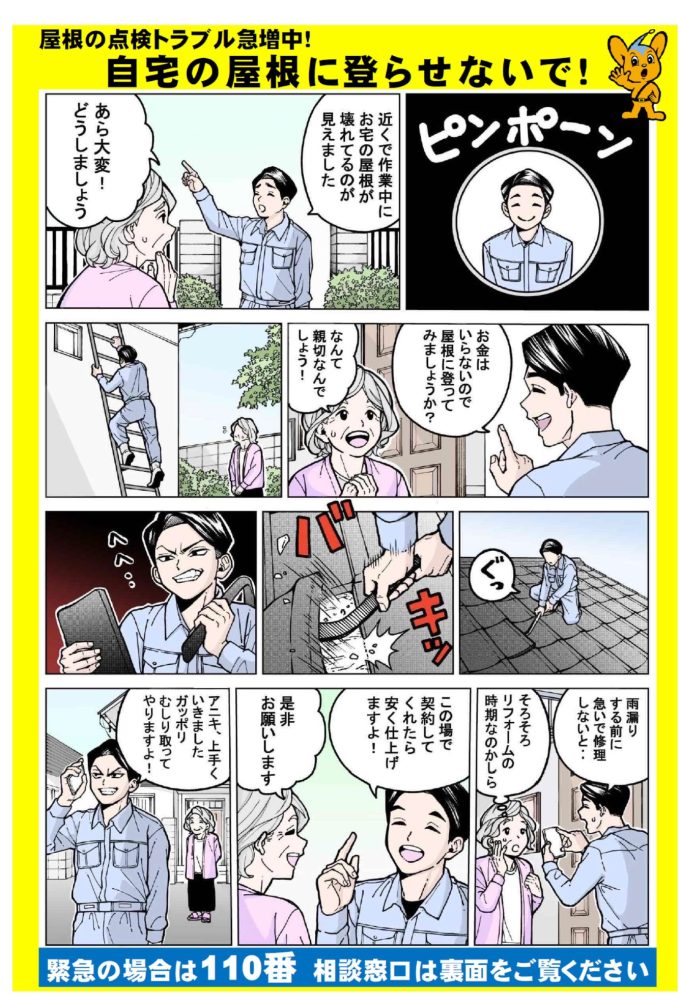 悪質業者は、突然訪問して「無料点検」を持ち掛けるなど、言葉巧みに不要な工事契約を結ぼうとするので、きっぱり断る。