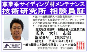 有限会社大江塗装工業(茨城県常総市)会社名:有限会社大江塗装工業 責任者=相談員氏名:大江 市郎 相談員=役職代表取締役社長相談員の資格建築施工管理技士窯業サイディングメンテナンス診断士シロアリ防除・木材防腐技術者団体検査員住所〒303-0016 茨城県常総市新井木町670-2TEL0297-23-0616FAX0297-22-5123相談員メールアドレス info@ohe-p.jpホームページhttp://www.ohe-p.jp/