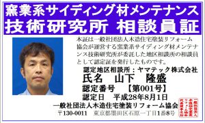 ヤマテック株式会社(神奈川県伊勢原市)会社名:ヤマテック株式会社 責任者=相談員氏名:山下 隆盛 相談員=役職代表取締役社長相談員の資格建築士窯業サイディングメンテナンス診断士戸建住宅劣化診断士シロアリ防除・木材防腐技術者団体検査員住所〒259-1148 神奈川県伊勢原市下糟屋東2丁目54番地TEL0463-71-6398FAX0463-71-6881相談員メールアドレス yamashita@yamatech.netホームページhttps://with-reform.net/